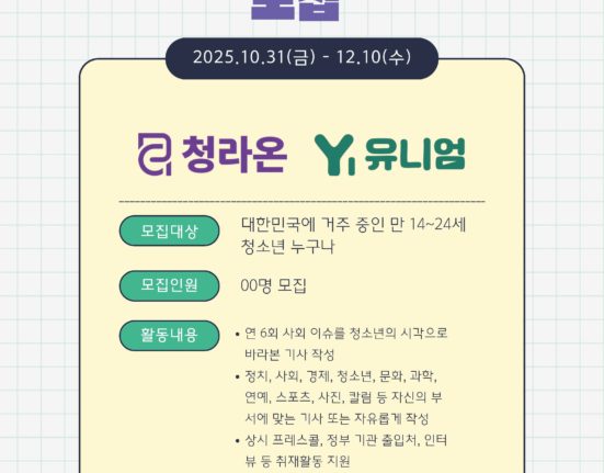 [청라온=문아린 기자] 수완뉴스(대표 김동주)가 청소년 및 대학생 기자단을 2025년 7월 28일부터 8월 31일까지 모집한다고 밝혔다. 공식 모집 마감일은 8월 31일이지만, 인원 충원 시 조기 마감될 수 있다.