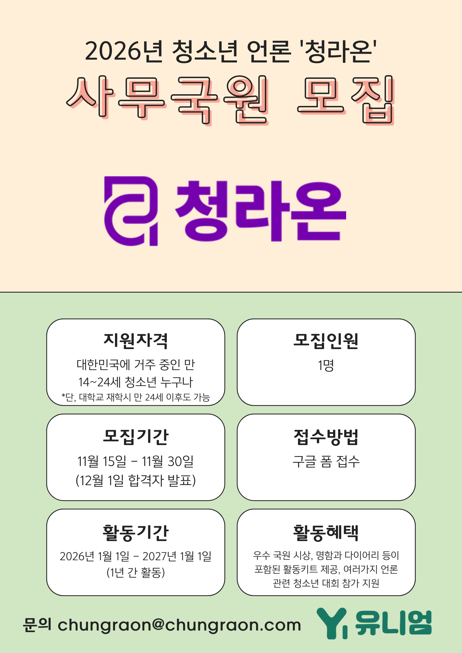 청소년단체 “유니엄” 산하 청소년 언론 청라온(단장 안창민)이 2026년을 함께 운영할 청소년 사무국원을 11월 15일부터 11월 30일까지 모집한다.